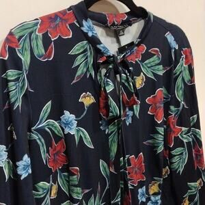 Add a touch of the tropics to your wardrobe with this beautiful navy midi dress from Eloquii. Featuring a stunning floral pattern, long sleeves, and a knee-length hemline, this dress is perfect for any occasion. The pullover closure and stretchy fabric make it comfortable and easy to wear, while the neck tie adds a touch of elegance.