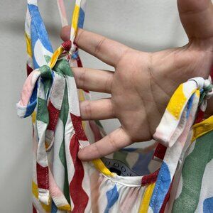 Striped maxi with low back easy A line dress halter neck ties with shoulder strap Shirred flounce hem Hi Lo hemline Unlined Flowy rayon/challis Maxi length- hits below knee Plus size piece, definitely gives retro groovy vibes. Standout piece for summer. Gently used with no flaws, size 22/24. See photo for approx. measurements in inches. 849