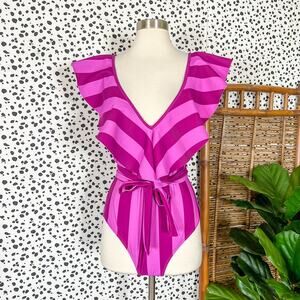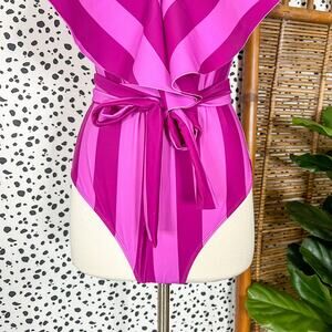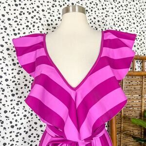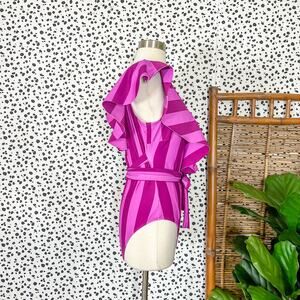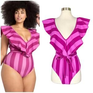 Eloquii | Striped Pink Magenta Ruffle Plus Size Belted One Piece Swimsuit 14 GUC