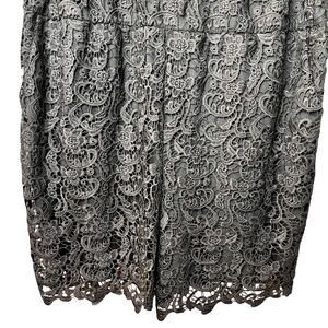 Back zipper and hook and eye closure at the neck lined below the chest with lace at the neckline. Solid black pattern, round neckline, short sleeves, made from a polyester blend fabric. Great piece for a special occasion.