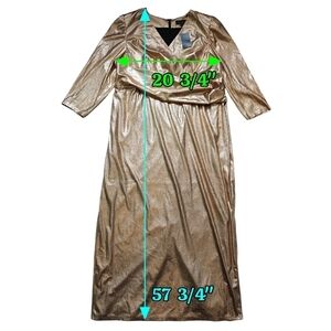 New with tag. A shimmering gold maxi dress. Has a surplice v-neck/faux wrap chest, front band, and 3/4 sleeves. Lined, with shoulder pads. Easy to maintain as it is machine washable.
