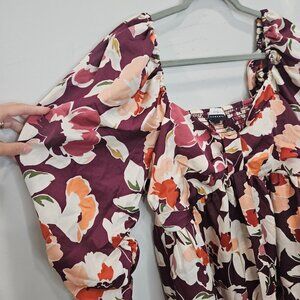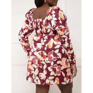 Eloquii Purple Floral Sweetheart Neckline Long Sleeve Short Mini Dress gently used but overall great condition. May have some minor little loose strings but nothing major. Stretchy smocked back. Unlined but not see through. Gathered detailing along the wrist of the sleeve.