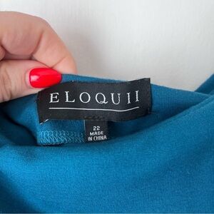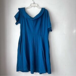 Eloquii Teal Blue Off the Shoulder Short Sleeve Fit & Flare Dress Plus Size 22. Folded off the shoulder neckline. short sleeve. fit & flare a-line style. side pockets. some minor pilling from wash and wear. pit to pit 24", length 36"