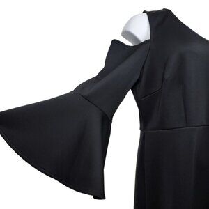 Eloquii cold shoulder flare sleeve scuba sheath dress in black. V-neck neckline. Back zip closure. Cold shoulder flared sleeves. Front slit. Comfort scuba stretch material. No stains or holes. Party cocktail holiday evening dress..
