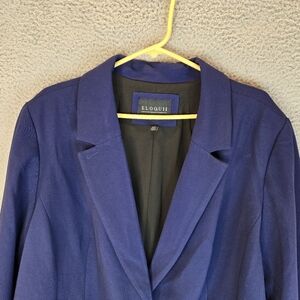 Elevate your wardrobe with this stunning navy blue blazer from Eloquii. This blazer is perfect for any occasion, whether it's a party, cocktail event, or business meeting. The blazer features a notch lapel style, two-button front button style, and single-breasted cut. It is made of a blended fabric of polyester, rayon, and spandex, which makes it comfortable and machine washable.