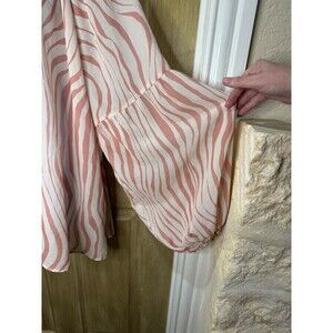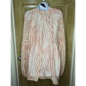 This is an Eloquii women's blouse with a zebra print balloon long sleeve design in size 24. The top features a beige color with pink accents and button details, and a sheer material. It has a tunic style and is suitable for various occasions like travel, parties, work, and casual wear. The blouse is made of polyester, has a button closure, and is machine washable. Perfect for adding a colorful touch to your wardrobe.