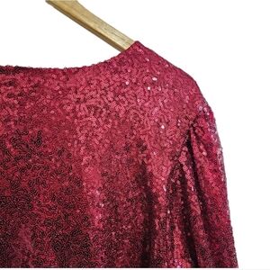Eloquii burgundy red sequins puff sleeve v-neck midi wrap dress size 20 lined, long sleeve , pullover , flat lay 23" pit , 20" waist, 25" hip, 40" length preloved condition, no smoking