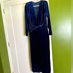 Elegant long velvet dress with v-neckline and twist detail at the waist. Long sleeves. 95% polyester / 5% spandex. 100% polyester lining and 100% nylon lace. Excellent pre-owned condition with no flaws. Same day shipping.