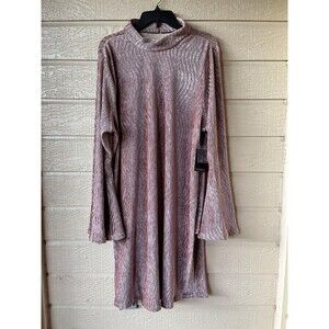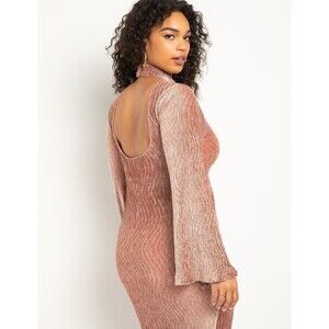New with Tag, Eloquii women's Salmon Pink Textured Velvet Stretchy Knit Open Back Mini Sheath Dress, size 24, high neck with 2 button & loop closure at back neck, long flare sleeves with 11 inch slit at side seam.