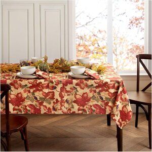 Printed watercolor leaves tossed on our easy car polyester tablecloth make this the perfect style for both Thanksgiving and all Autumn long. Coordinating napkins are available. Tablecloths Sold individually.
