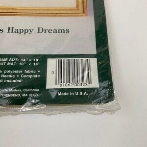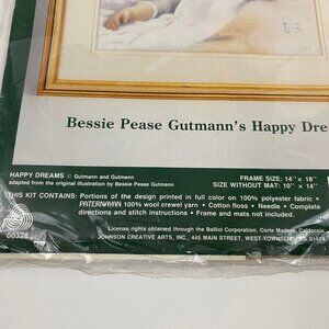 Elsa Williams Crewel Embroidery Kit Bessie Pease Gutmann’s Happy Dreams. Sleepy young child sleeping in bed with a teddy bear. Made in USA. Portions of the design printed in full color on 100% polyester fabric. New in package. Bag has some sticker remainders.