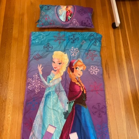 Like new, barely used - maybe once inside house? Frozen Elsa & Anna sleeping bag. Velcro straps for rolling up to store away. Zipper closure. Soft light purple fleece inside. So comfy!