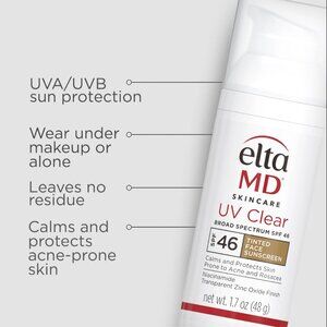 "EltaMD UV Clear Broad Spectrum SPF 46 is a lightweight sunscreen with a sheer tint to help even skin tone. Formulated with high-purity niacinamide (vitamin B3) to help reduce the appearance of blemishes and discoloration on your skin for a more smooth appearance. This broad spectrum sunscreen contains micronized zinc oxide to protect your skin from damaging UVA (aging) and UVB (burning) rays.