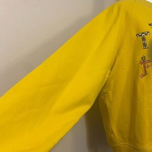 In good preowned condition. Yellow color isn’t as bright as shown in pic. See the outdoor photo for the more accurate yellow color. Slight spot on sleeve. Please note in the picture. It is very faint and can hardly see it.