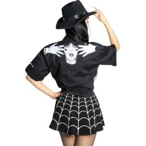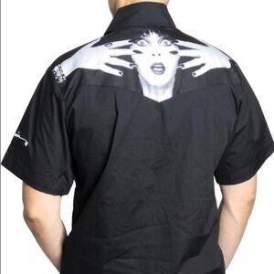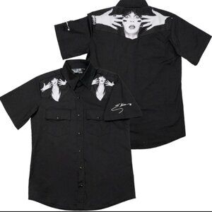New with tags. Saddle up with Elvira! The officially licensed Elvira Mistress of the Dark Classic Logo Western Shirt, Features Elvira striking her iconic pose printed on the shoulders and across the back with her signature embroidered on the sleeve. Includes black snap buttons and front pockets for some frightful flair. Crafted from a cotton poly blend fabric with short sleeve detail for maximum comfort and breathability. The perfect addition to any gothic western wardrobe or Elvira fanatics closet! Bolo tie not included, if you're interested in it message me :)