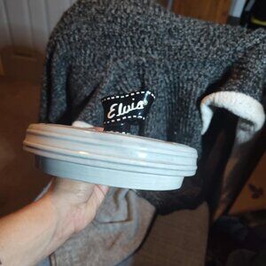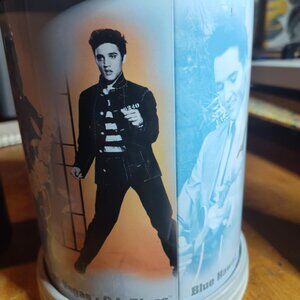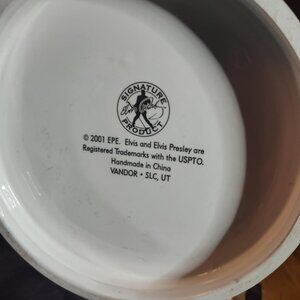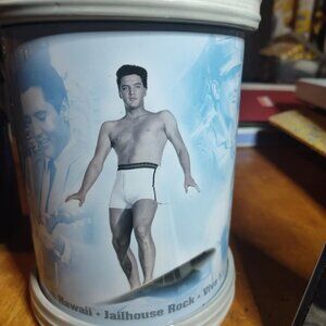 The product is a ceramic and metal cookie jar featuring a design that pays homage to Elvis Presley and his famous movies. This unique piece of music memorabilia captures the essence of the King of Rock 'n' Roll with its film reel theme from 2001. Made in China, this original item is a must-have for any fan of Elvis or music memorabilia collector looking to add a touch of nostalgia to their collection.