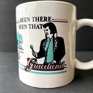 Ivory white coffee mug souvenir from Elvis Presley's Graceland in Memphis, Tennessee. Featuring a car, the fancy gates, front elevation of the mansion, and The King himself, with the phrase "Been there, seen that" in black, teal, and pink. Very good used condition with light wear, including small scrape on Elvis' front--please see pictures.