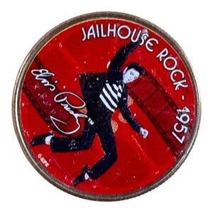 This collectible coin celebrates the legacy of Elvis Presley and his iconic 1957 hit "Jailhouse Rock." Encased for preservation, it's a timeless keepsake for fans.