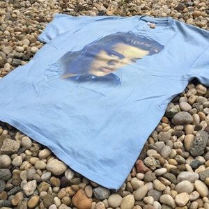 Elvis Presley portrait on light blue tee. Average wear. Light cracking in the portrait. Nice vintage feel. Light discoloring in the armpits, not super noticeable.