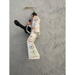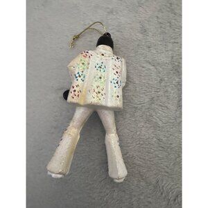 A detailed Elvis Presley ornament featuring a glittery white jumpsuit and multicolor accents. Perfect for collectors or music enthusiasts during the holiday season.