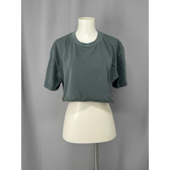 Style: Womens cropped short sleeve shirt with a boxy, relaxed fit and raw edge details at the neckline and hem.