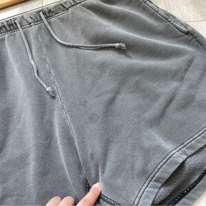 Elwood Organic Cotton Sweat Shorts in the color Gray. Elastic waistband with drawstring, approx 5" inseam. Heavyweight, breathable, french terry fabric. Size xlarge, womens. In pre-loved condition, does have some stains on front and one hole at corner of pocket as shown in photos. Price reflects condition. 100% organic cotton. Perfect loungewear, casual, all seasons, athleisure style.