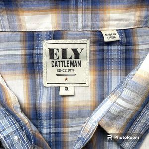 This Ely Cattleman shirt is a must-have for any Western-themed wardrobe. The blue and white plaid pattern with pearl snap closure and collared neckline add a touch of classic cowboy style. The long sleeve shirt is made of machine washable material and features pockets, making it perfect for all seasons. The shirt is size XL and has a regular fit size type. It's ideal for casual occasions and can be styled with any outfit. Get ready to add a touch of Western charm to your wardrobe with this Ely Cattleman shirt!