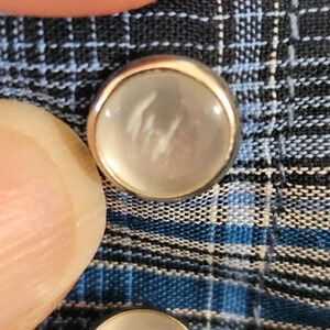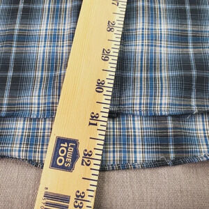 Western Cowboy shirt in blue plaid with metallic silver stripes. The fabric is thinner and light weight, great for Country/Square dance. Silver pearl snap button, front pockets. Minute snag on front and sleeve. Some pearl snap buttons have minute scuffs, barely noticeable.