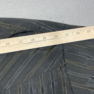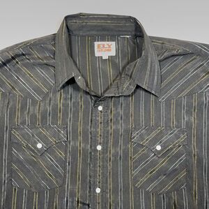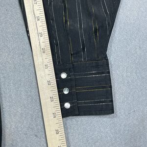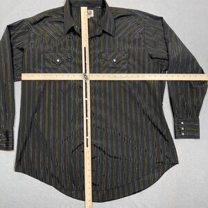 Pre-owned. No rips, stains, or holes. Features pearl snap buttons, pointed yoke front and back, dual chest pockets, and a black base with thin gold and white pinstripes. Classic western styling in a roomy XXL fit—perfect for country concerts, line dancing, or everyday western wear.