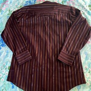 Still feels stiff like it’s new without tags. Metallic stripes of gold and silver in a Bordeaux colored shirt. Measured in photos. Most accurate color in last photo for color reference.