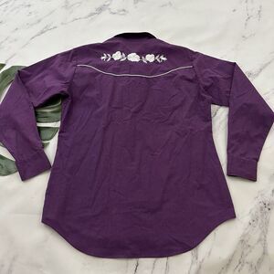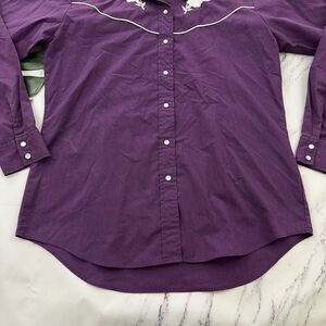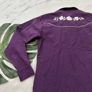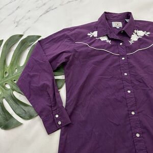 Ely Country Charmer women's vintage purple and white floral embroidered pearl snap western shirt, size L. It is free from any rips or stains. It measures about 42 inches around the bust and is about 27 inches long.