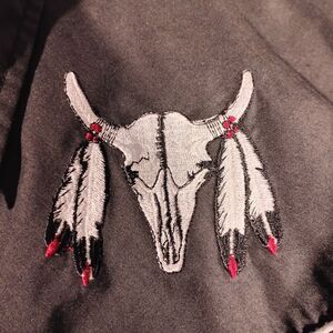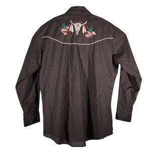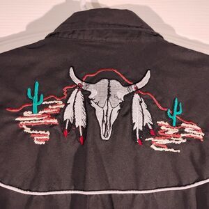 Ely Diamond pearl snap shirt mens L Large black skull embroidered feather
