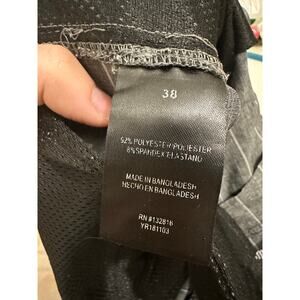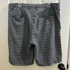 Elysian casual board shorts. Great for beach, swimming, or surfing. Medium gray color (Charcoal) with white horizontal pinstripes. Unlined. Zipper front with button. Drawstring inside. Belt loops too. Has mesh-lined pockets. Some buttoned. Good used condition. One pull on the front. Seam at the butt also has a broken thread but inner construction is solid. See closeups. Polyester spandex material. Size 38 ( waist). Feel free to make a reasonable offer. Or browse & message me for a great bundle deal!