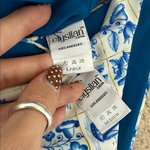 Blue and white patterned bikini barely worn top is a large bottoms are medium, I recommend both for a medium