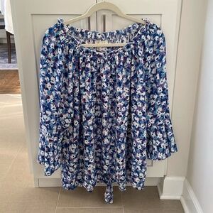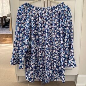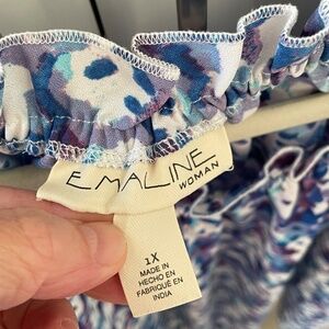 Emaline blouse, size 1X, in fun pattern of blue, purple, and white. Fabric is 100% polyester and washes well on (cold) gentle cycle. Hang dry and it's unlikely you'll need to iron or steam it (I never did). Length is slightly longer in back. Back measures approximately 27" from top of elastic collar to bottom of hem. Details include a pretty bell 3/4-length bell sleeve and a small keyhole/tie at the bottom of the front side of the top. Looks new. Non-smoking and pet-free home.