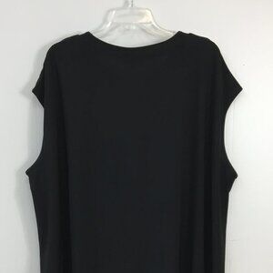 Emaline Women's Montarey Sleeveless Multi-Color Floral Blouse Size 2X NWT, embellished jeweled deep scoop neck, multi-color floral pattern on front, solid black back, cap like sleeveless at shoulders, polyester spandex blend, lightweight, stretchy, casual, comfortable, flowy, shift like, thin
