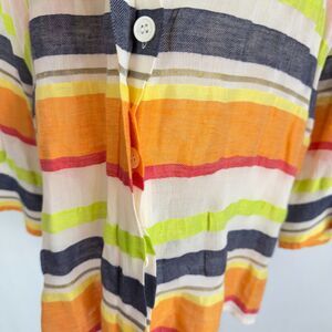 White long sleeve blouse with red, navy blue, orange, yellow, lime green and gold stripes.