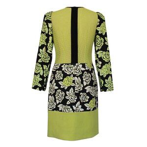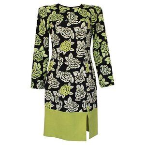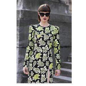 This striking Emanuel Ungaro dress, seen on Coco Rocha at Paris Fashion Week and Zendaya, commands attention with its bold lime-green floral print set against a black backdrop. The structured shoulders and sleek silhouette give it a powerful, modern edge, while the thigh-high slit adds a daring, fashion-forward touch. A contrasting chartreuse panel at the hem anchors the graphic print and brings unexpected polish. The back reveals a panel of tonal dotted texture and a center zipper, adding depth and elegance from every angle.