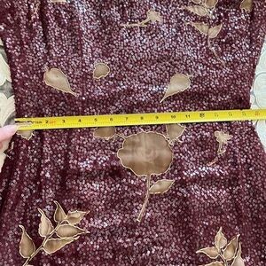 Emanuel Ungaro Ombré de la Nuit Sequined Long Sleeve Evening Dress/Gown, in dark red with golden olive brown floral and leaf motifs. The larger floral pieces feature a slightly darker ring at their center (see 8th & 9th photos).