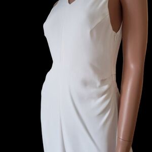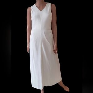 Excellent pre owned condition. Emanuel Ungaro Vintage Off White Silk Blend Column Dress. Pleated waistline. Bust darts. Sleeveless. Gathered sides of bodice. Side zipper, slit back. Fully lined. No size tag. Flatlay measurements: