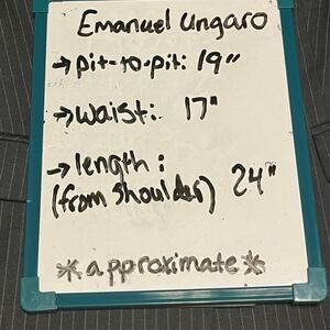 sophisticated Emanuel Ungaro pinstripe blazer. Crafted from a premium wool blend with Lycra for stretch, this tailored jacket features a sleek gray pinstripe pattern, a three-button front closure, notched lapels, flap pockets, and a fully lined interior. Perfect for polished office outfits, interview attire, or commanding boardroom presence. The flattering silhouette and quality construction make this a timeless addition to any career wardrobe. Size 10. Shell: 49% wool, 48% polyester, 3% lycra. Lining: 100% acetate. Made in China.