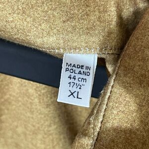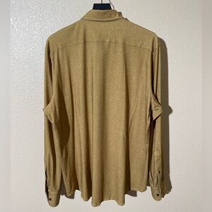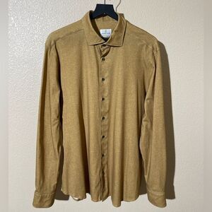 Stylish gold button-up shirt with a classic collar and black buttons.