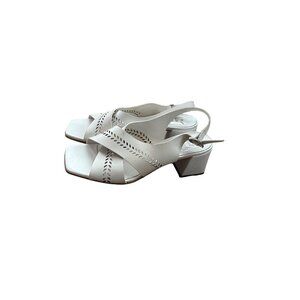 Stylish white leather sandals by Emanuele Crasto. Comfortable block heel and elegant cutout design. Perfect blend of comfort and sophistication.