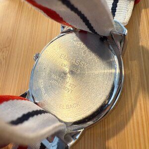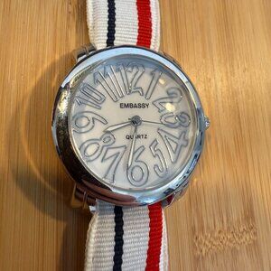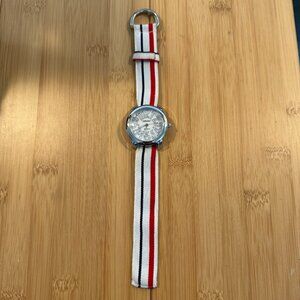 Excellent condition! Runs great with a brand new battery. Minimal signs of cosmetic wear. This model has a silver tone metal case with a red, white, and blue pass-through canvas band. The dial is white with large silver bubble number accents. Box not included