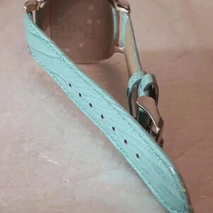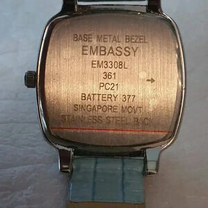 Embassy EM3308L Silver/Rhinestone Women's Watch Excellent used condition. Watch features a silver bezel with rhinestones, silver dial with silver hour markers, and a blue leather strap. Case diameter is 35mm. Watch has a new battery in it also. Really pretty watch.