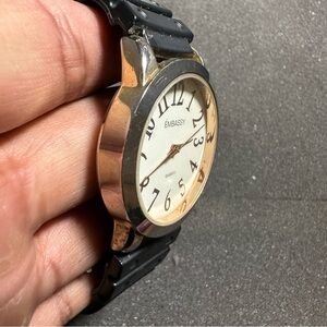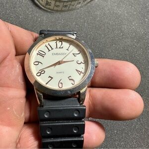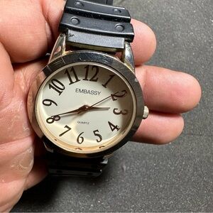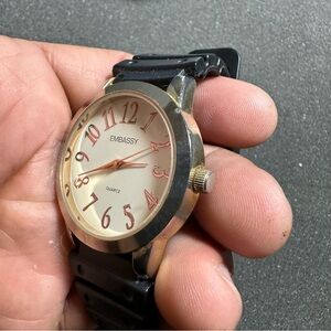 Embassy Mens Quartz Watch Gold Tone Black Strap White Dial (EM3365L) Working strap is not original shows signs of wear such as scratches on case and crystal as well as discoloration of gold tone see pictures for reference