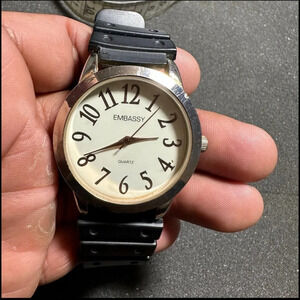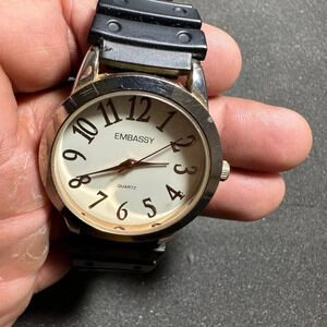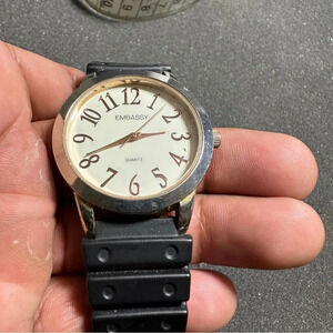 Embassy Mens Quartz Watch Gold Tone Black Strap White Dial (EM3365L) Working strap is not original shows signs of wear such as scratches on case and crystal as well as discoloration of gold tone see pictures for reference