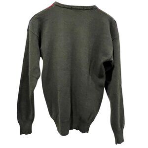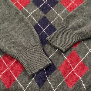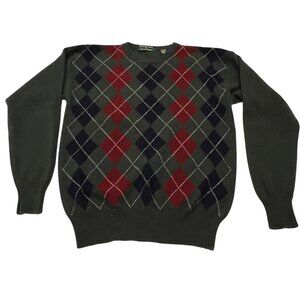 This 2-ply cashmere-wool blend sweater features a crew neck, long sleeves, and an argyle pattern on the front. Excellent condition, no holes or stains, dark green, navy, maroon, and white, size medium