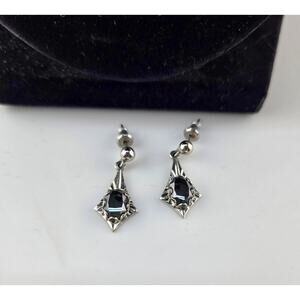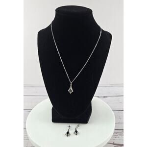 This nice vintage piece includes a necklace and a pair of earings. The stone is black hematite and the backing is flat back sterling silver with a 16" box chain.