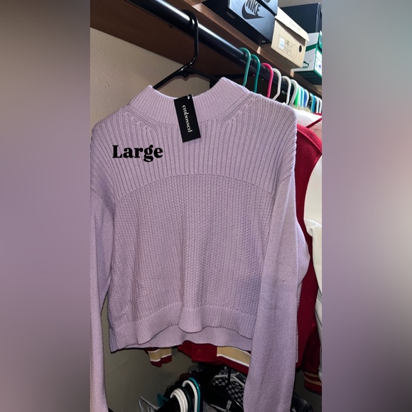 Soft lavender ribbed knit sweater. Mock neck and relaxed fit. Cropped hem with ribbed trim. Versatile layering piece.